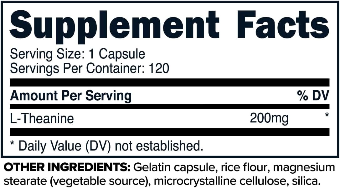 • Pure L-Theanine Power: Each capsule contains 200mg of high-quality L-Theanine, a natural amino acid found in tea leaves renowned for its potential to promote relaxation without sedation.